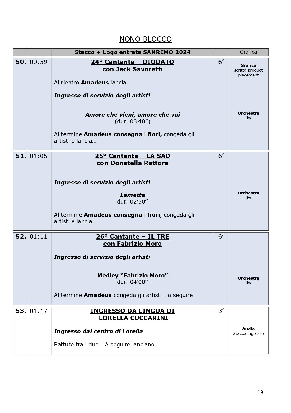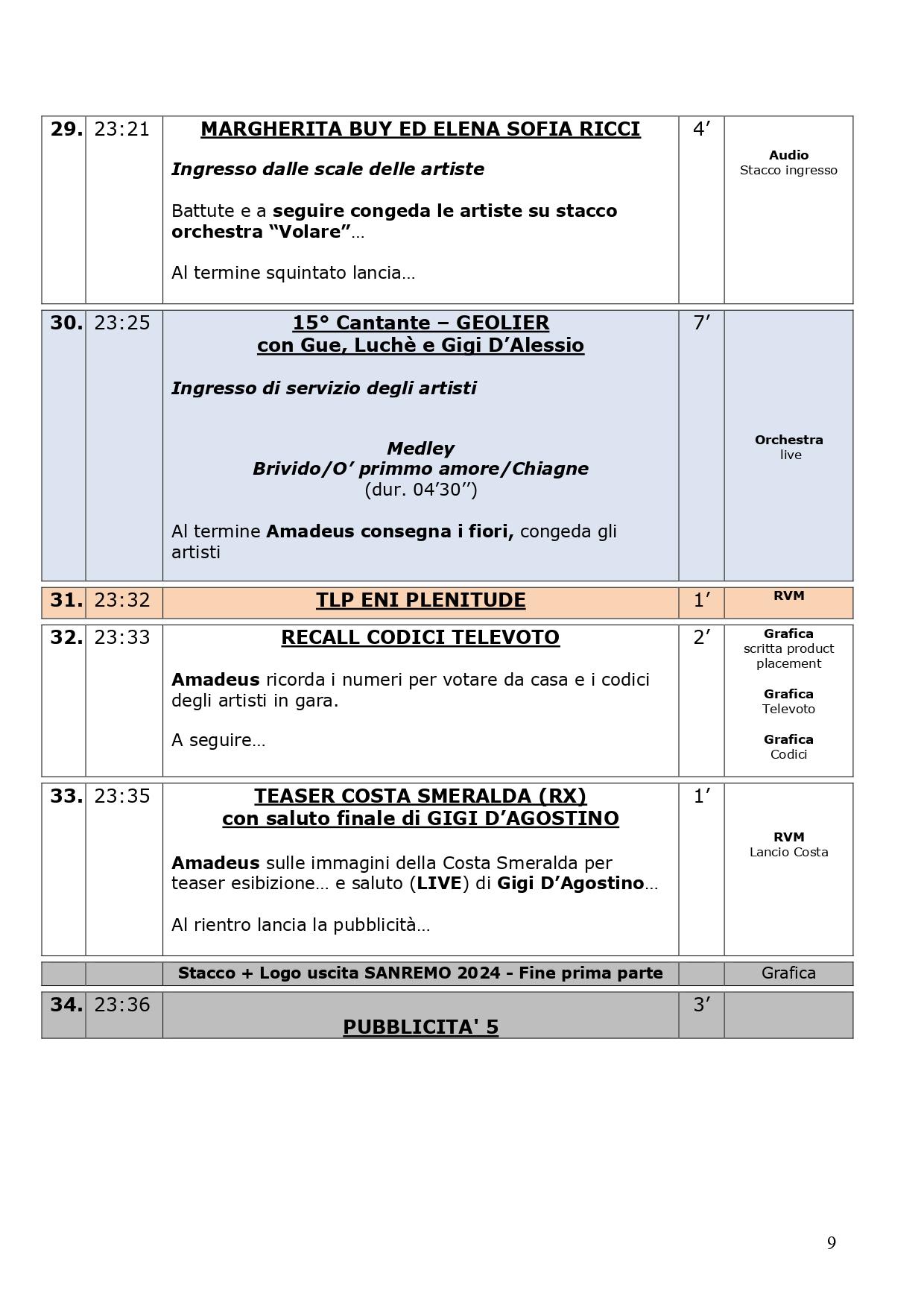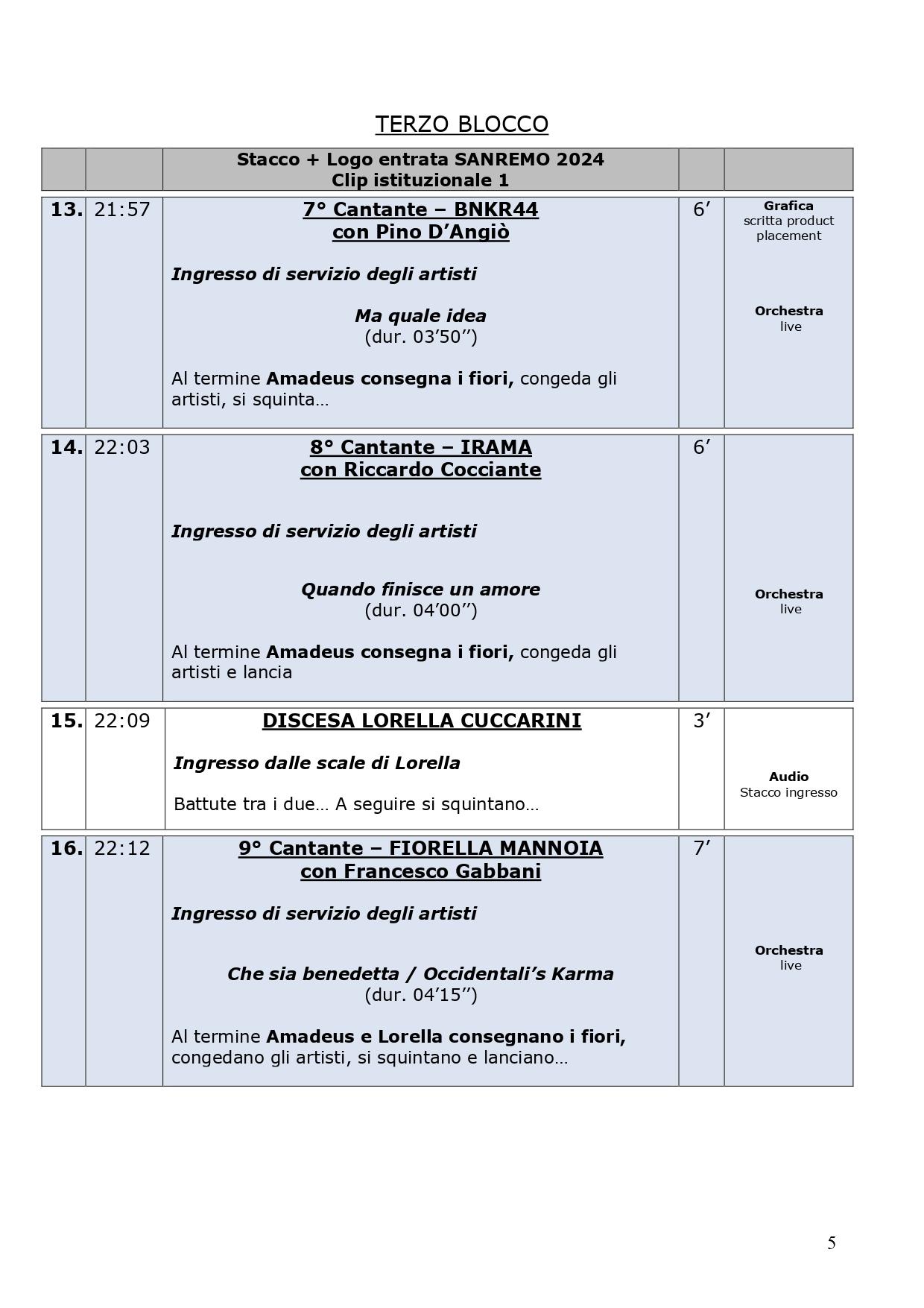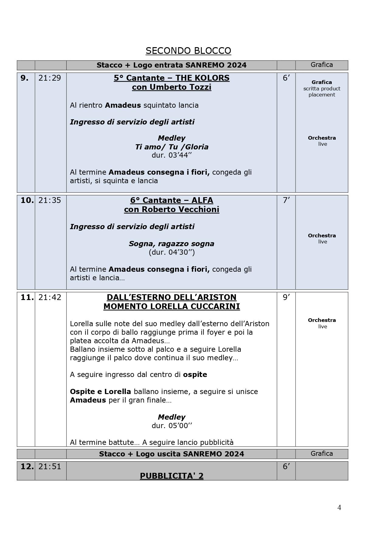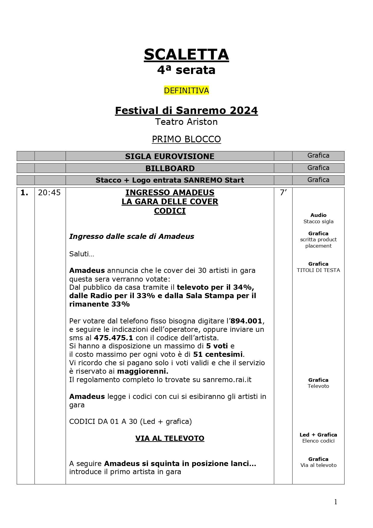 La scaletta completa della quarta serata di Sanremo 2024: ecco le anticipazioni, gli orari dei 30 cantanti in gara, dei loro ospiti per i duetti e degli ospiti non musicali della kermesse, con lo svolgimento passo dopo passo di venerdì 9 febbraio, nella serata dedicata alle cover. Pausa di un giorno dalla gara con le canzoni inedite e come di consueto al venerdì ci sono le cover, che verranno realizzate dagli artisti in gara insieme a uno o più ospiti in duetto. Non solo: nei pdf diffusi dalla tv di Stato che vi mostriamo di seguito, sono previsti gli orari esatti di ogni esibizione, ma anche le anticipazioni sui siparietti di Amadeus e sui momenti dedicati agli ospiti, uno su tutti Pecco Bagnaia. La co-conduttrice di questa quarta serata è Lorella Cuccarini. La serata si chiuderà alle ore 2.10 circa. Ecco di seguito tutte le informazioni.