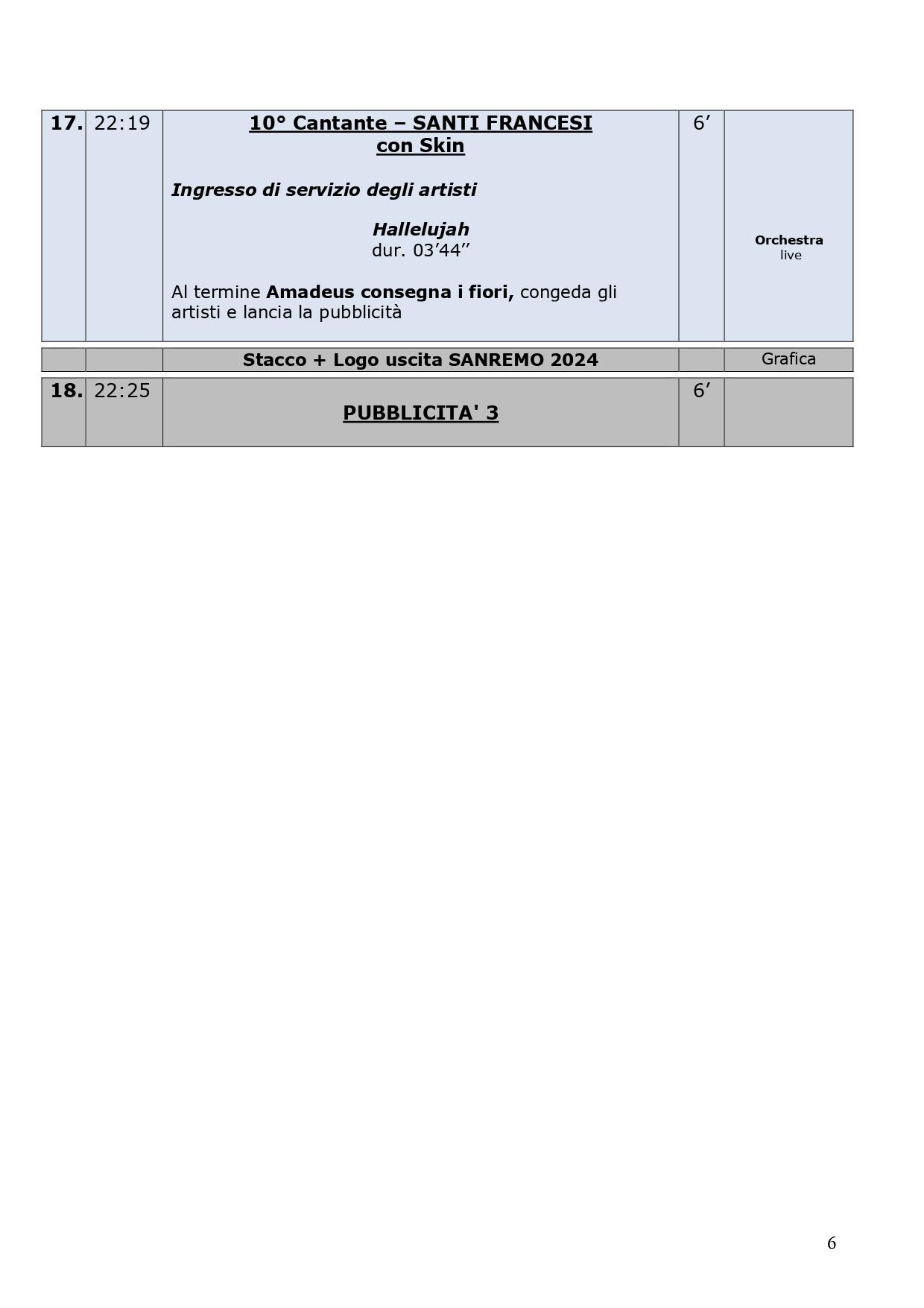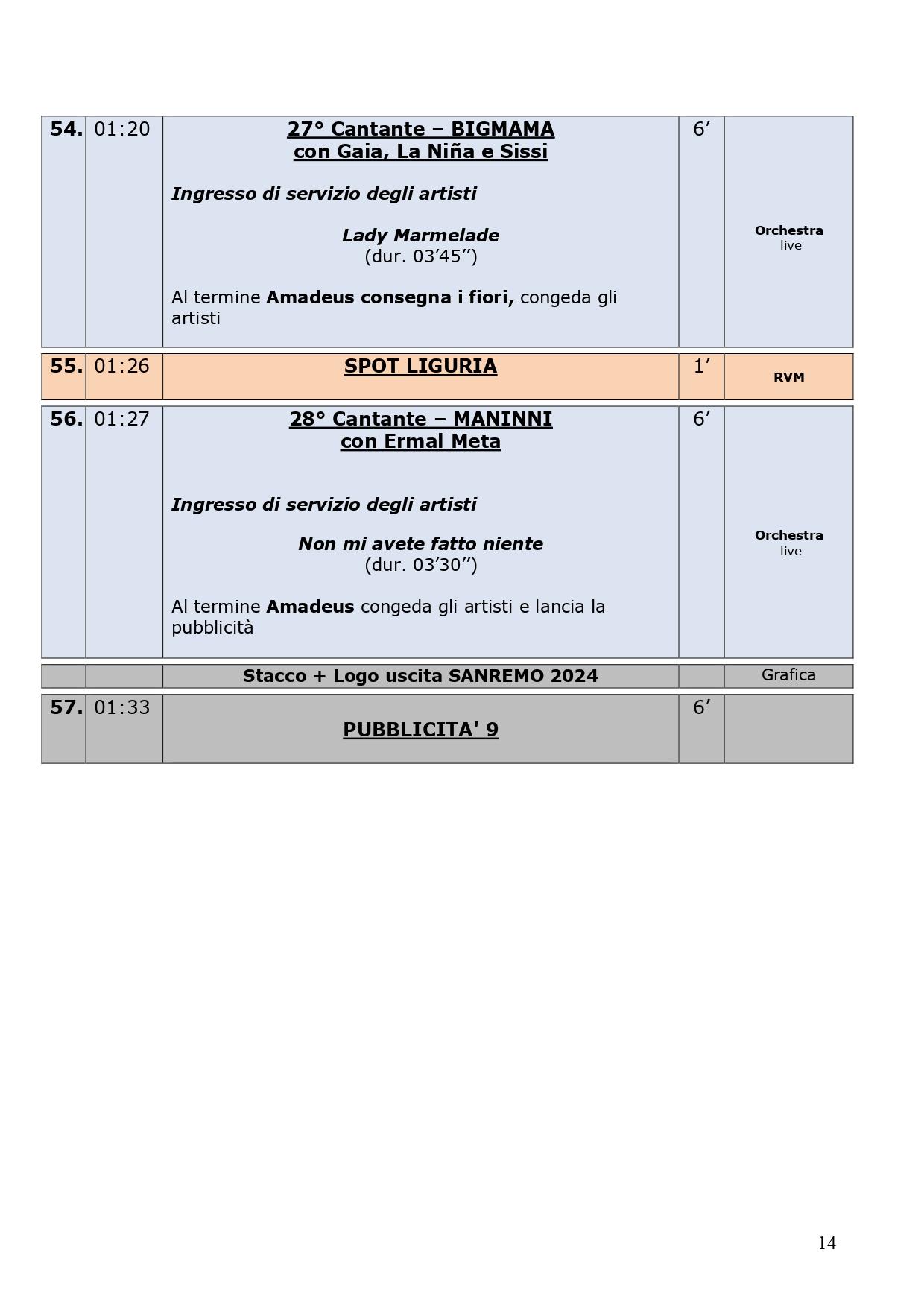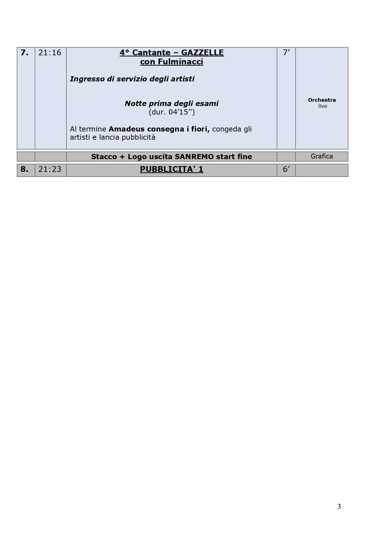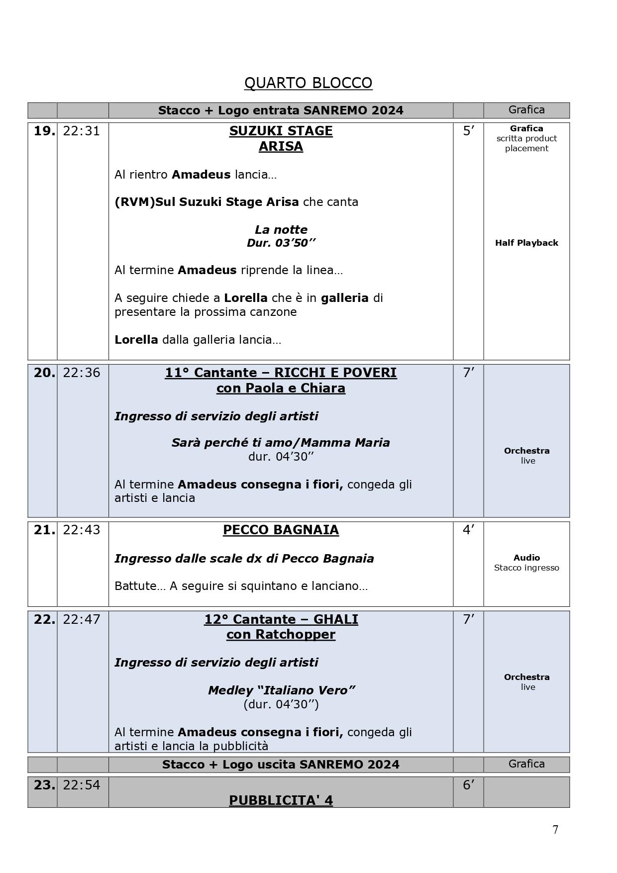 La scaletta completa della quarta serata di Sanremo 2024: ecco le anticipazioni, gli orari dei 30 cantanti in gara, dei loro ospiti per i duetti e degli ospiti non musicali della kermesse, con lo svolgimento passo dopo passo di venerdì 9 febbraio, nella serata dedicata alle cover. Pausa di un giorno dalla gara con le canzoni inedite e come di consueto al venerdì ci sono le cover, che verranno realizzate dagli artisti in gara insieme a uno o più ospiti in duetto. Non solo: nei pdf diffusi dalla tv di Stato che vi mostriamo di seguito, sono previsti gli orari esatti di ogni esibizione, ma anche le anticipazioni sui siparietti di Amadeus e sui momenti dedicati agli ospiti, uno su tutti Pecco Bagnaia. La co-conduttrice di questa quarta serata è Lorella Cuccarini. La serata si chiuderà alle ore 2.10 circa. Ecco di seguito tutte le informazioni.