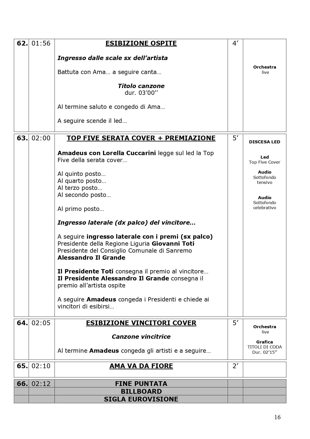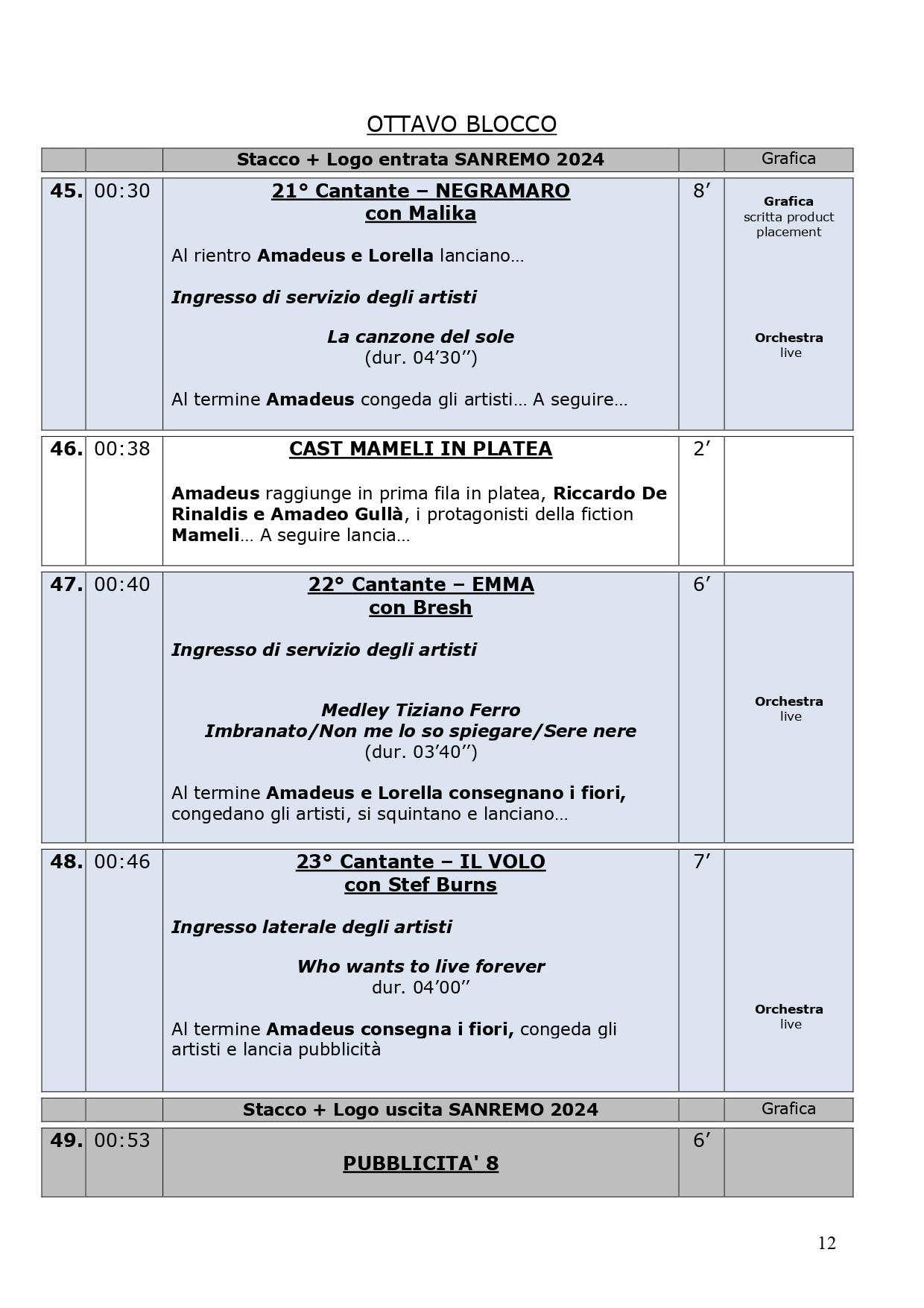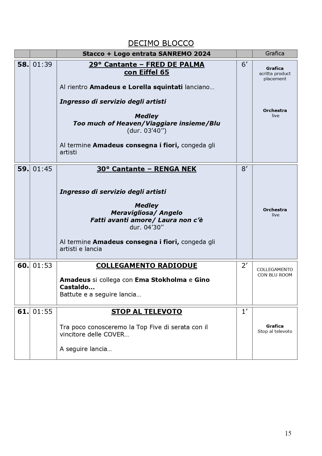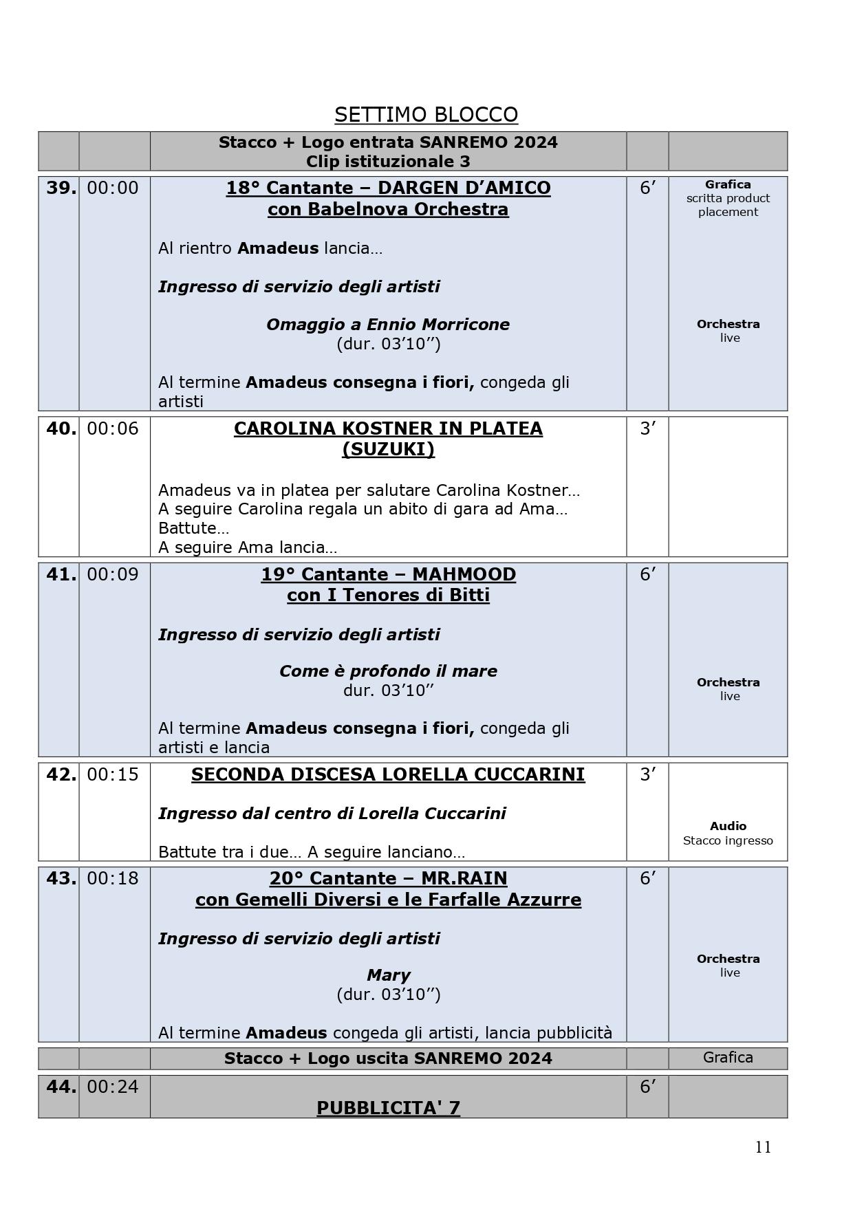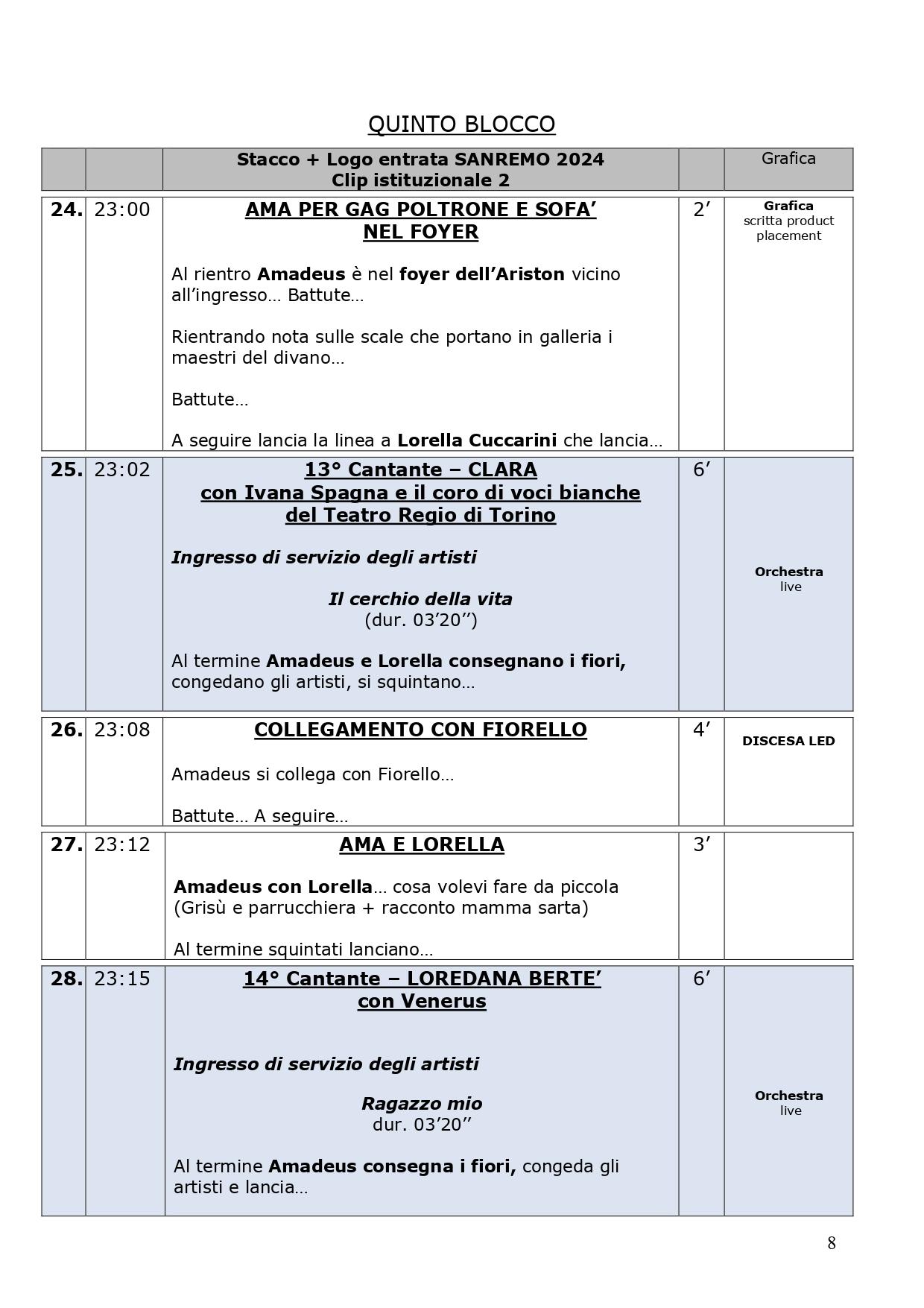La scaletta completa della quarta serata di Sanremo 2024: ecco le anticipazioni, gli orari dei 30 cantanti in gara, dei loro ospiti per i duetti e degli ospiti non musicali della kermesse, con lo svolgimento passo dopo passo di venerdì 9 febbraio, nella serata dedicata alle cover. Pausa di un giorno dalla gara con le canzoni inedite e come di consueto al venerdì ci sono le cover, che verranno realizzate dagli artisti in gara insieme a uno o più ospiti in duetto. Non solo: nei pdf diffusi dalla tv di Stato che vi mostriamo di seguito, sono previsti gli orari esatti di ogni esibizione, ma anche le anticipazioni sui siparietti di Amadeus e sui momenti dedicati agli ospiti, uno su tutti Pecco Bagnaia. La co-conduttrice di questa quarta serata è Lorella Cuccarini. La serata si chiuderà alle ore 2.10 circa. Ecco di seguito tutte le informazioni.