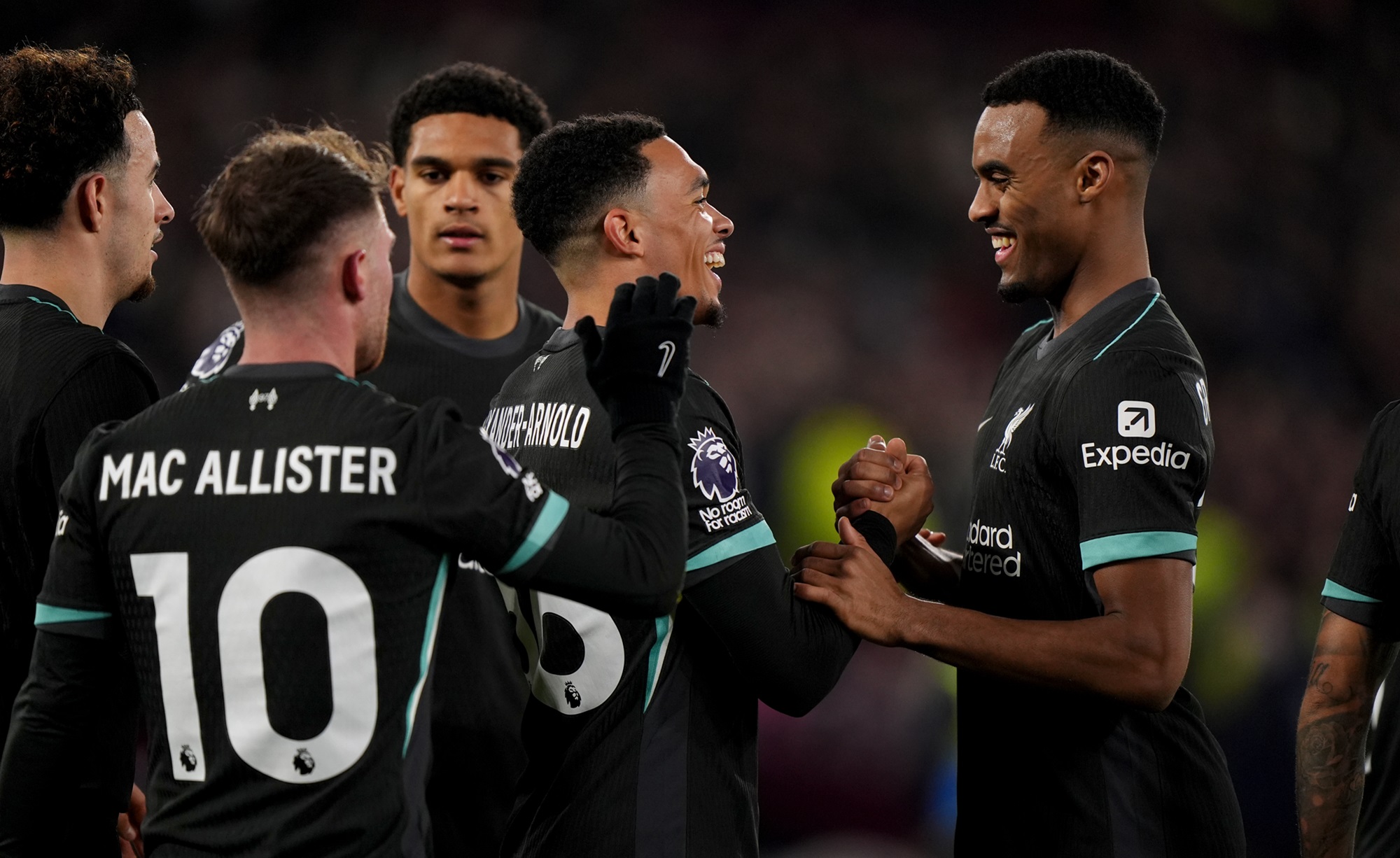 Liverpool’s Trent Alexander-Arnold (left) celebrates with his team mates after scoring his sides fourth goal during the Premier League match at the London Stadium, London. Picture date: Sunday December 29, 2024.