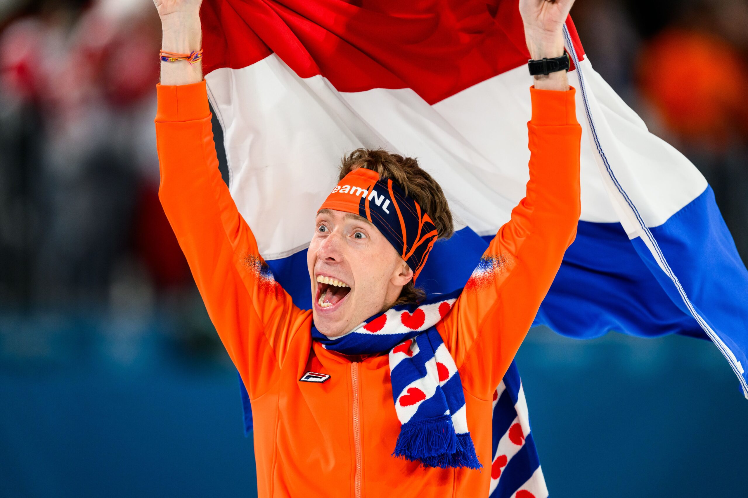 Jorrit Bergsma of Netherlands celebrates in men’s 10000m speed skating during day 7 of the 2026 Winter Olympics on February 13, 2026 in Milan.