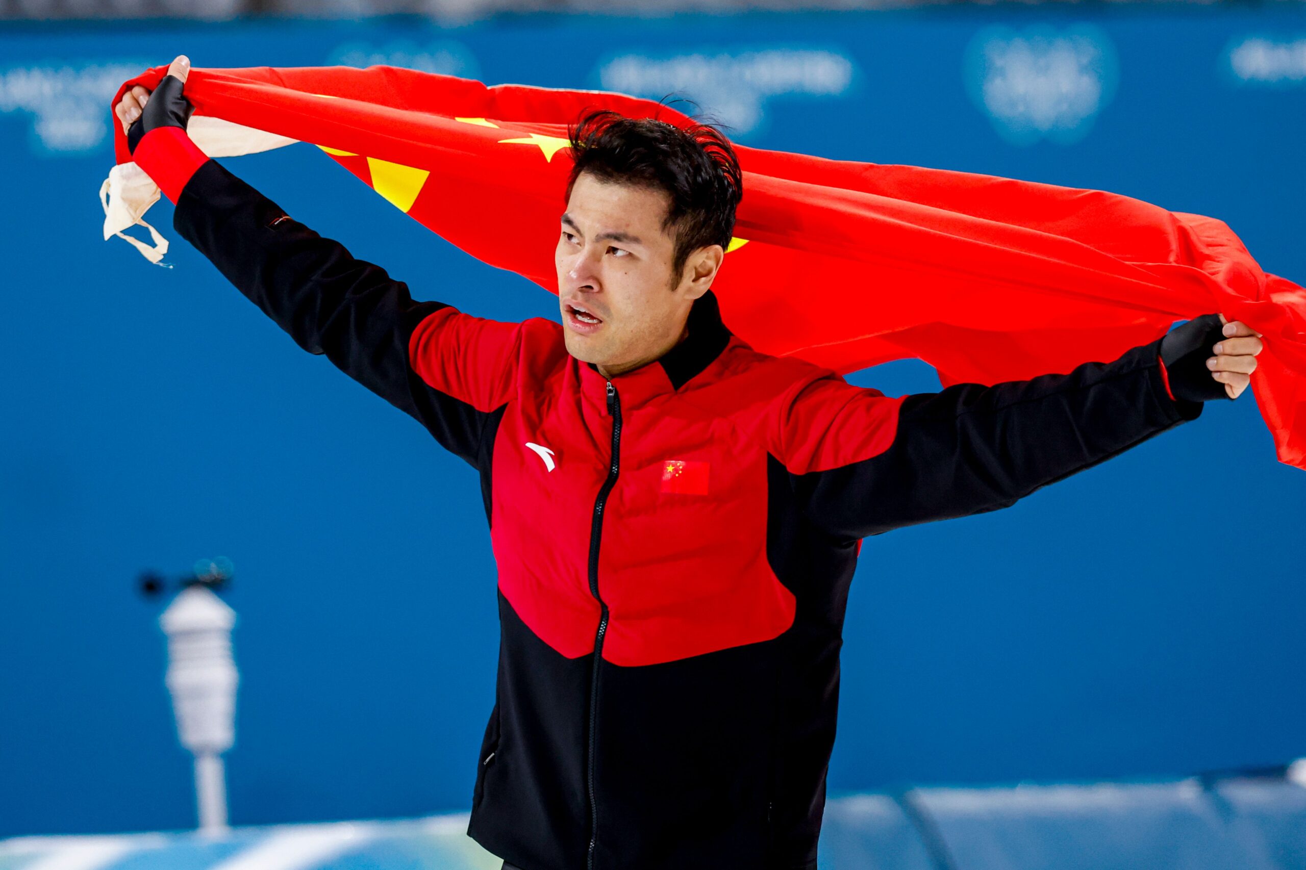 winner Zhongyan Ning of China celebrating and holding flag after competing on the Speed Skating Men’s 1500m on day thirteen of the Milano Cortina 2026 Winter Olympics at Milano Speed Skating Stadium on February 19, 2026 in Milan, Italy.