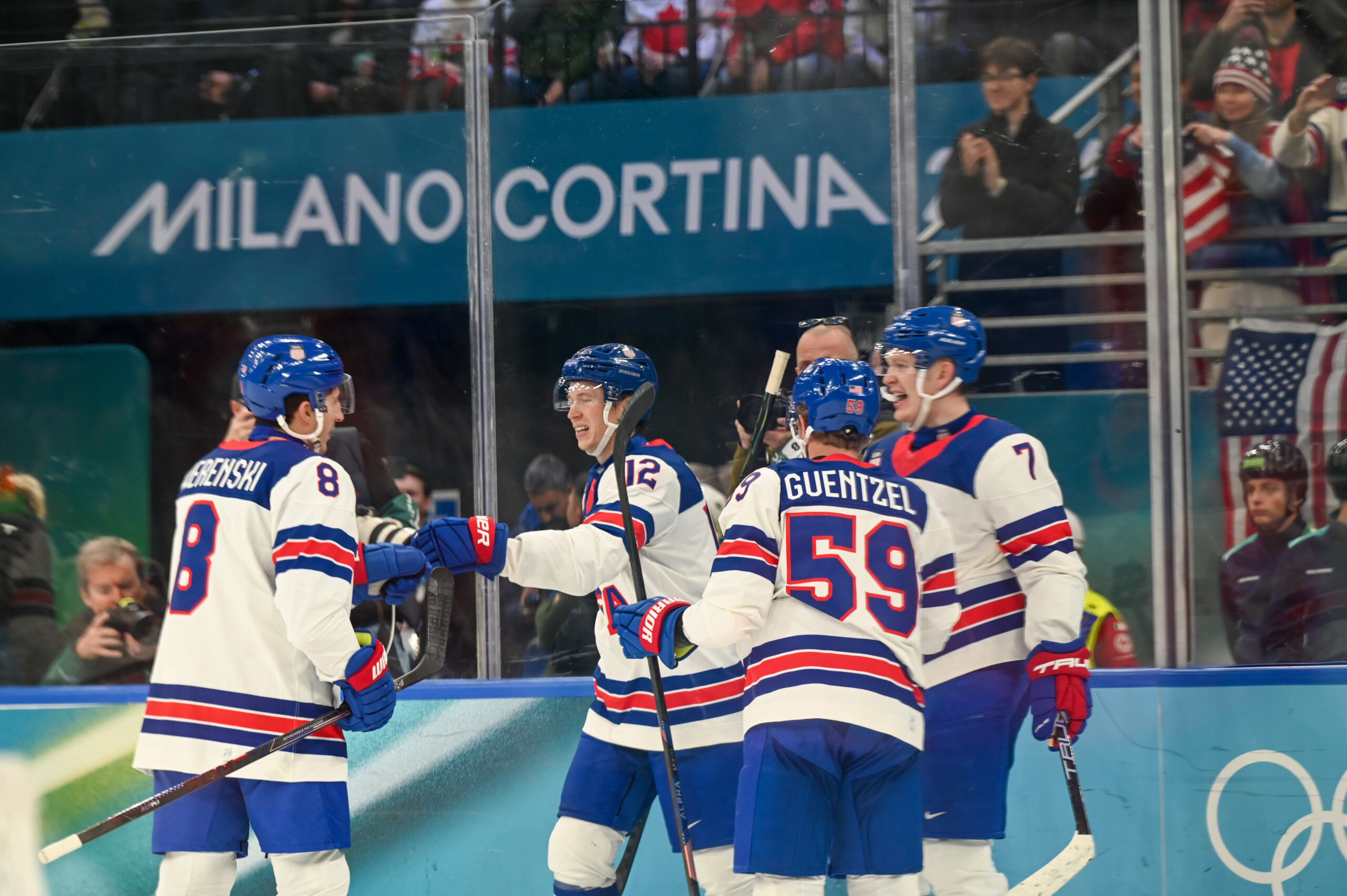 Team Usa exults during the Winter Olympic Games, Milano Cortina 2026, at the Milano Santagiulia IHO Arena, on February 20, 2026 in Milano, Italy