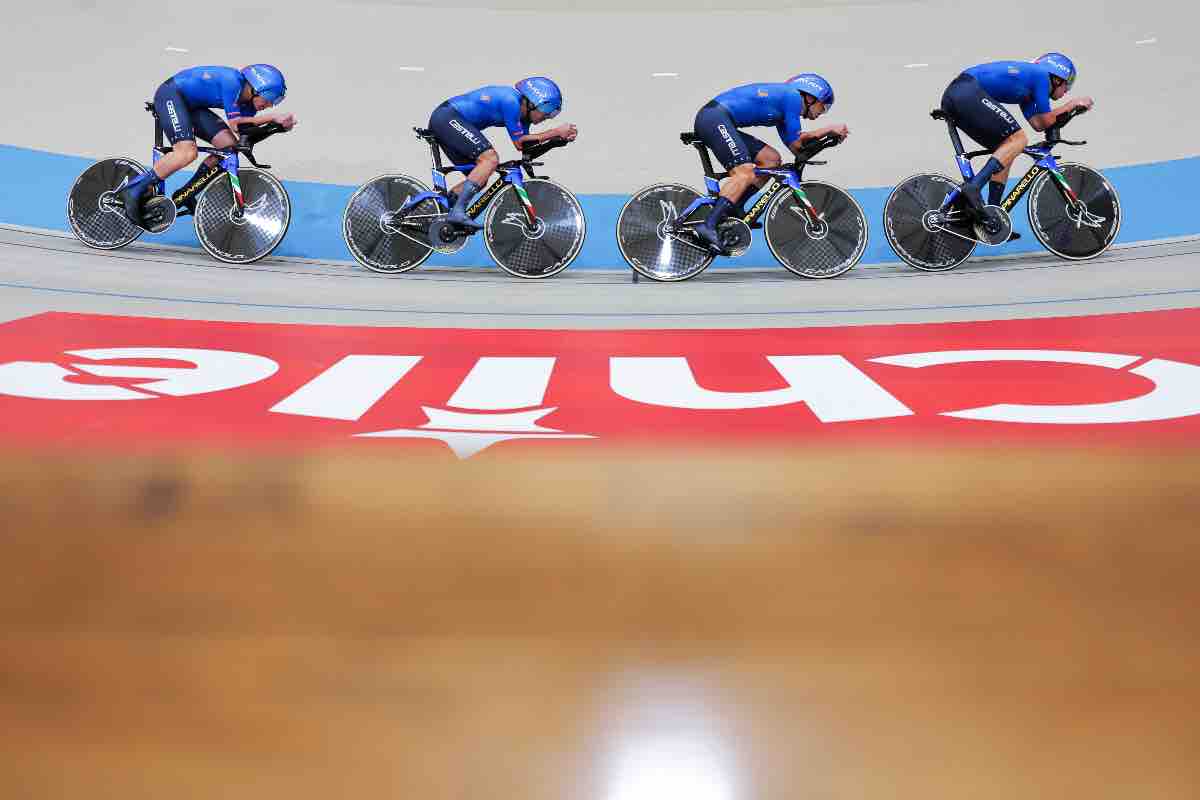 Cycling – 2025 Tissot UCI Track World Championships – Velódromo Peñalolén, Santiago, Chile – Men’s Team Pursuit – Qualifying – Davide Boscaro (Italy), Renato Favero (Italy), Luca Giaimi (Italy), Francesco Lamon (Italy)