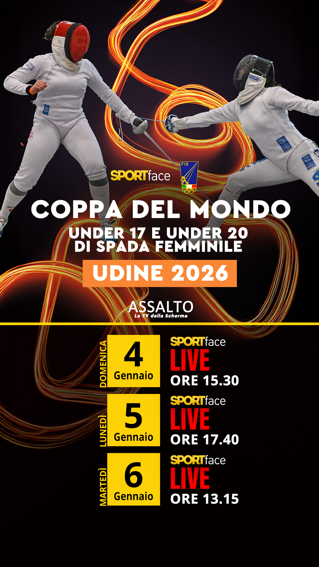 Le fasi finali delle tre giornate saranno trasmesse in diretta su Assalto – La TV della Scherma, punto di riferimento per gli appassionati.