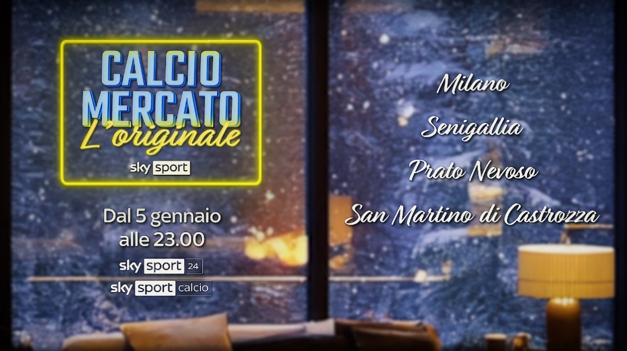 Dal 5 gennaio al 2 febbraio, ogni giorno alle 23 dal lunedì al venerdì, su Sky e in streaming su NOW si rinnova l’appuntamento tra i più attesi del periodo post natalizio: “Calciomercato – L’Originale”. La sessione invernale del mercato calcistico infiamma le serate di tifosi e appassionati e, per raccontare le manovre dei club italiani e internazionali, a partire da lunedì 5 gennaio su Sky e NOW torna “Calciomercato – L’Originale”, il grande classico dell’inverno che, con il suo inconfondibile stile brillante, approfondirà le trattative, il dietro le quinte del mercato, ma anche la cronaca dai campi con collegamenti quotidiani dai ritiri delle squadre e dagli stadi in occasione degli studi pre e postpartita delle serate di Serie A e delle competizioni UEFA.
