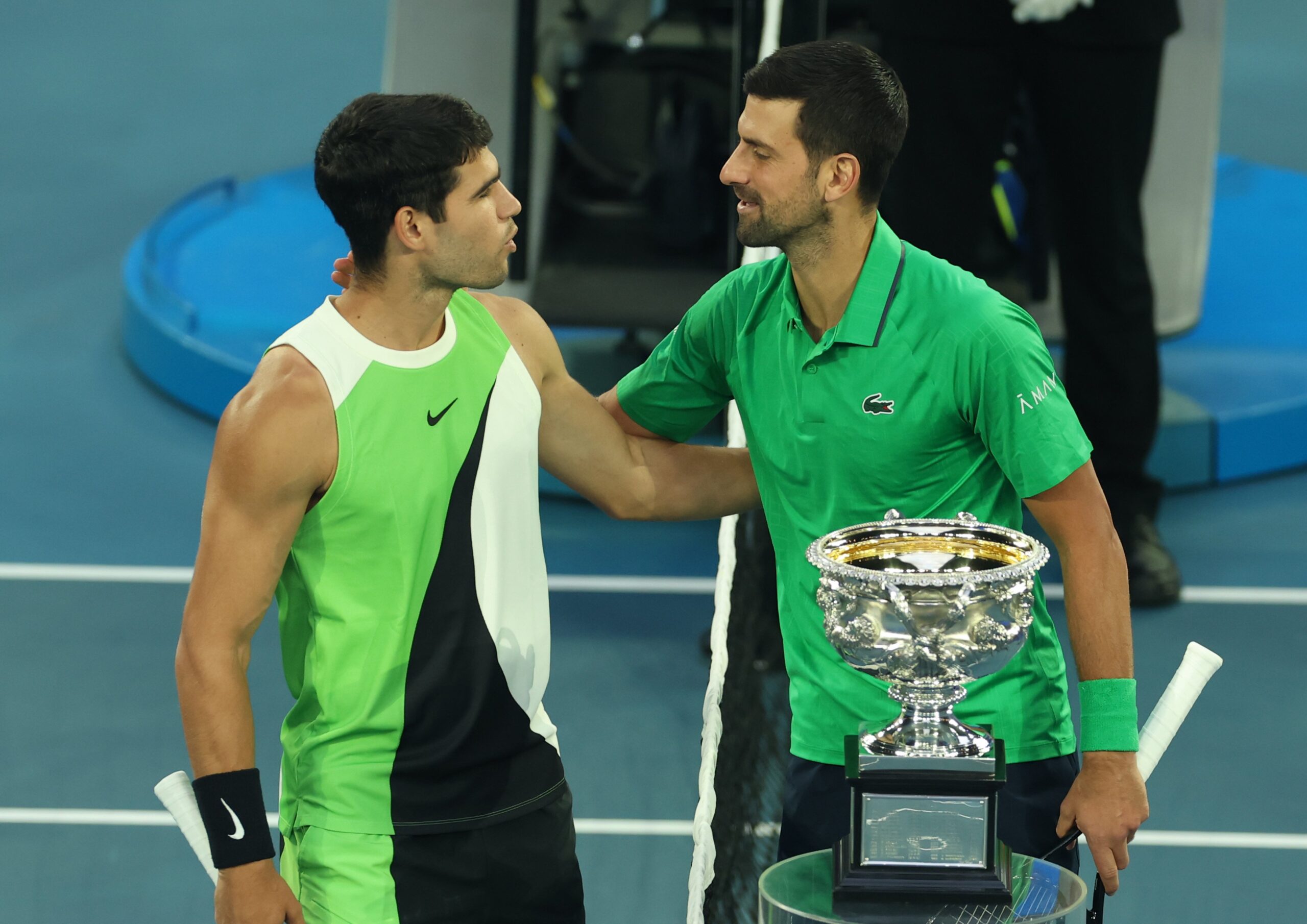 CARLOS ALCARAZ of Spain and NOVAK DJOKOVIC of Serbia before the match n the final of Australian Open, Melbourne, Australia.