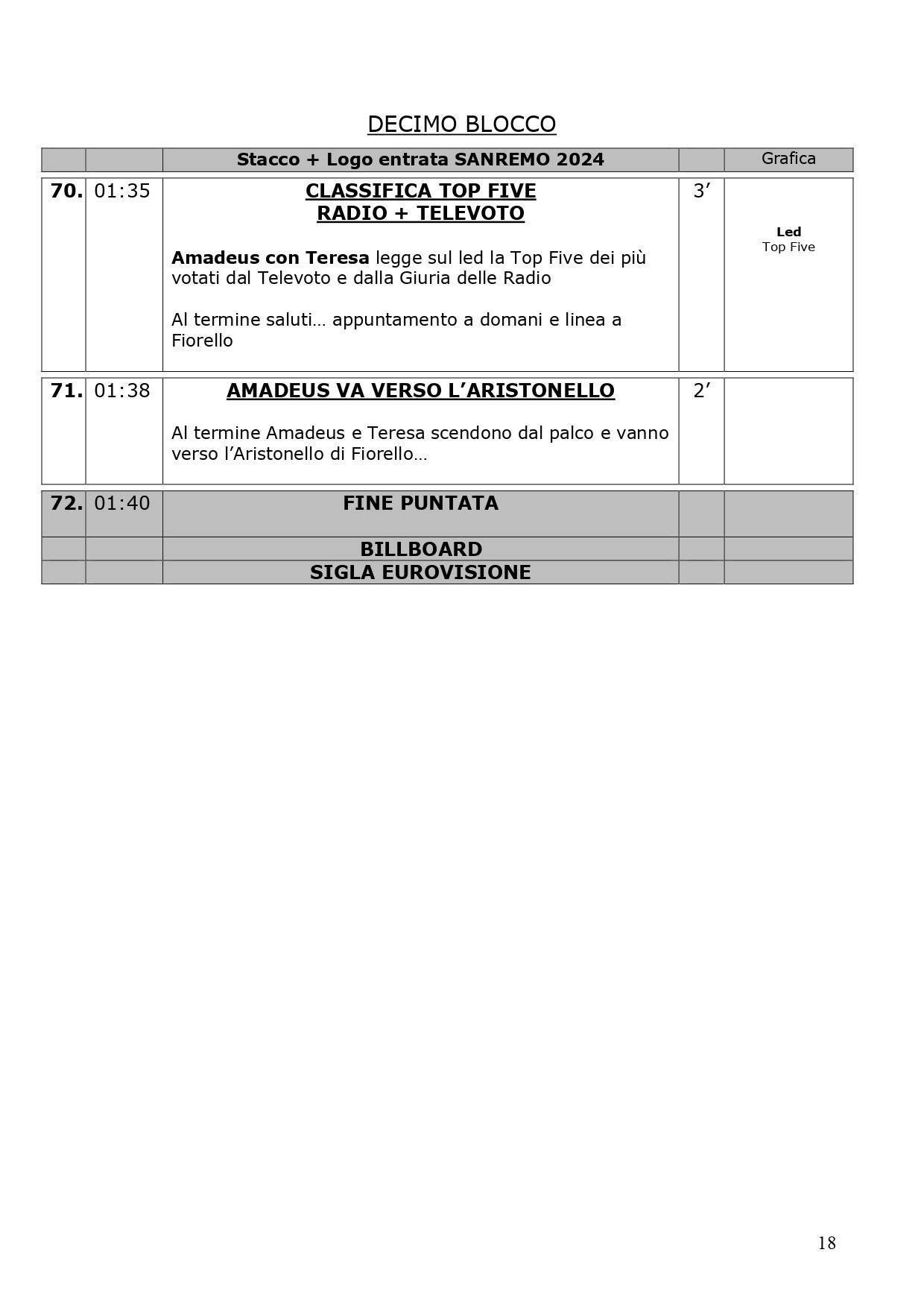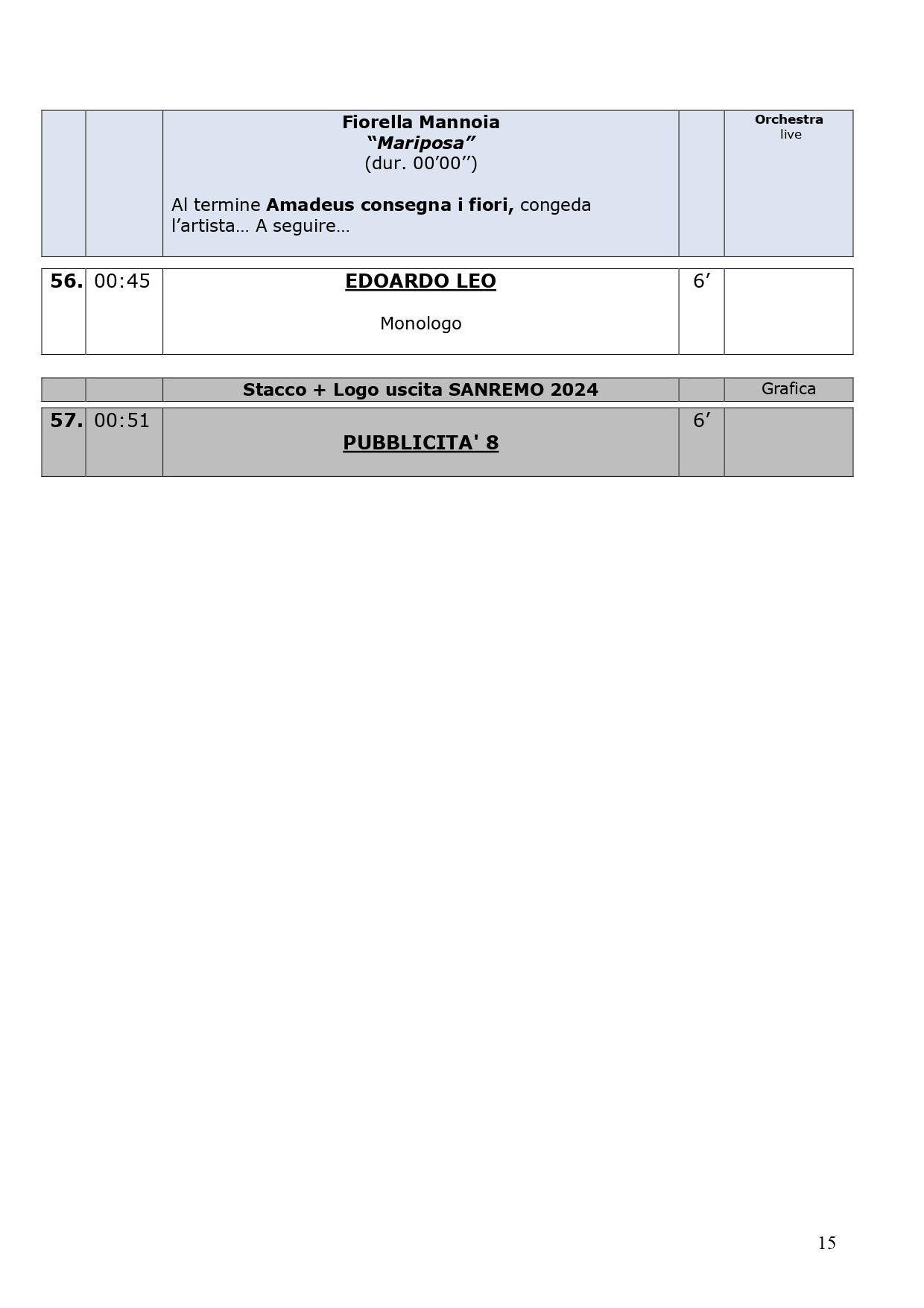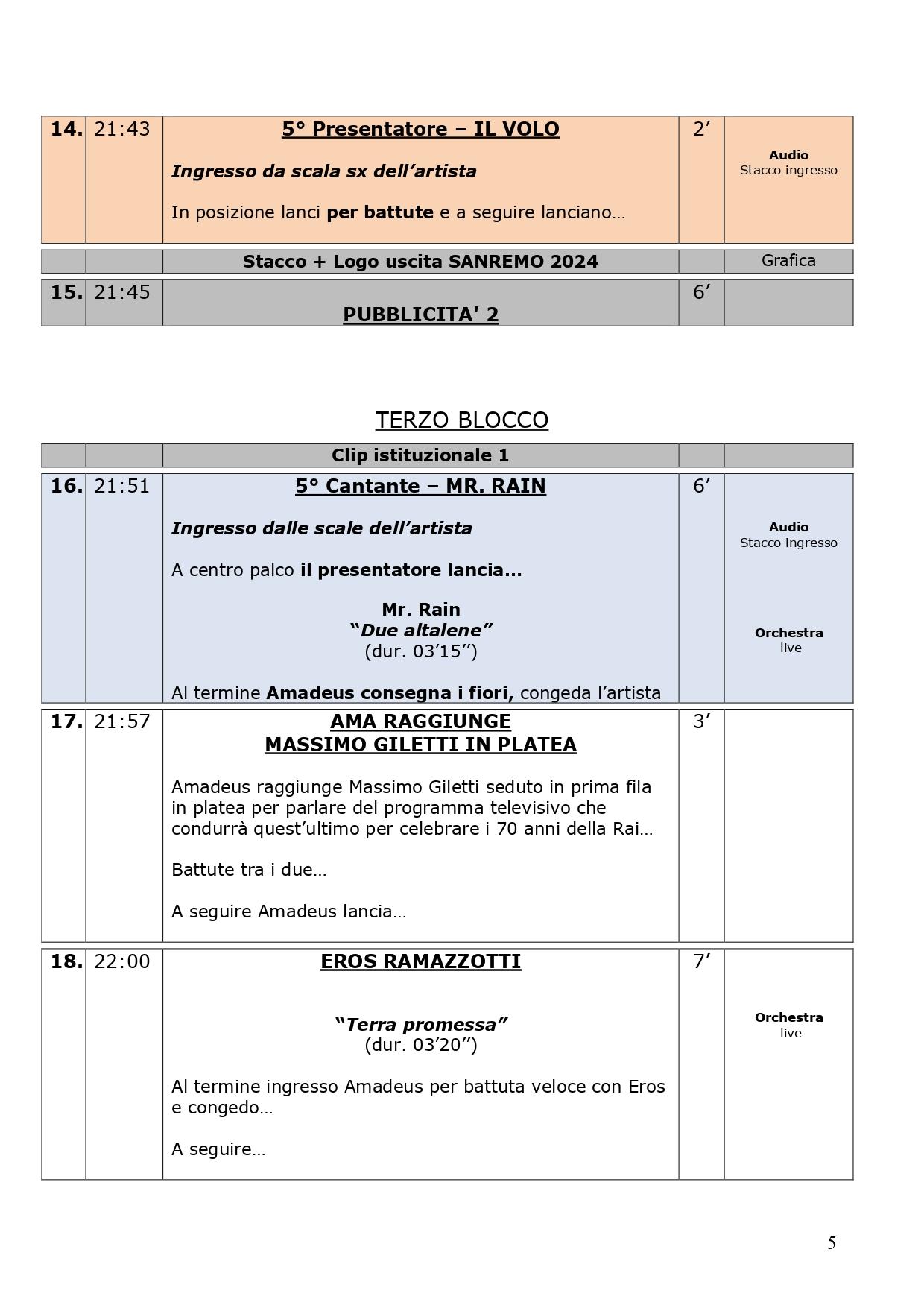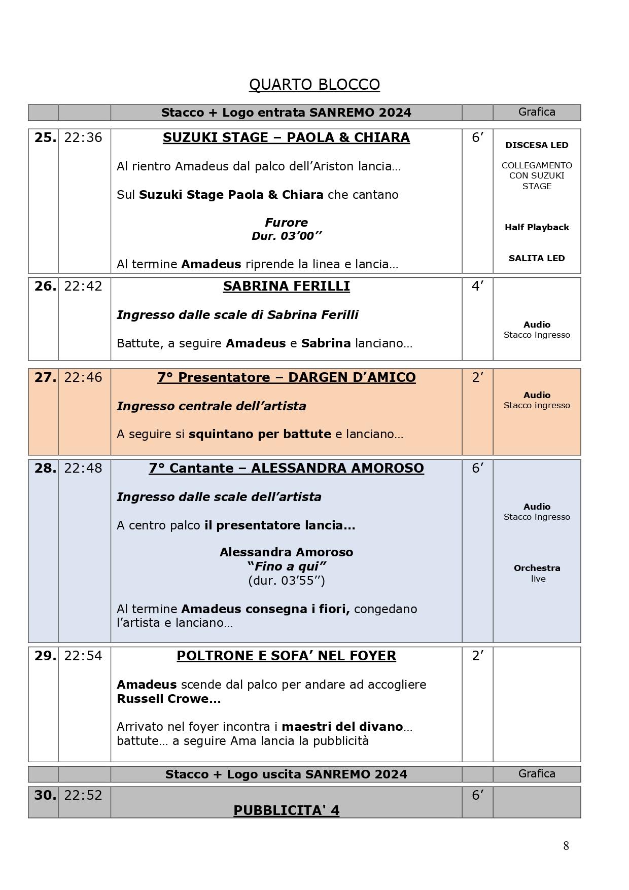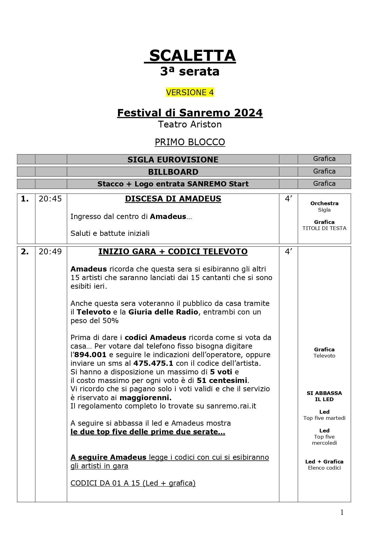 La scaletta completa della terza serata di Sanremo 2024: ecco le anticipazioni, gli orari dei 15 cantanti e degli ospiti e lo svolgimento passo dopo passo di giovedì 8 febbraio. Entra ormai nel vivo la kermesse canora trasmessa da Rai Uno e nella terza serata canteranno gli ultimi 15 cantanti dei 30 complessivi. Anche stasera gli altri 15 artisti, quelli che hanno cantato ieri, presenteranno i loro colleghi con accoppiamenti decisi dal sorteggio. In più, nei pdf diffusi dalla tv di Stato che vi mostriamo di seguito, ecco gli orari esatti di ogni esibizione, le anticipazioni sulle gag di Amadeus e sui momenti dedicati agli ospiti, che saranno, tra gli altri, Russell Crowe, Eros Ramazzotti e Gianni Morandi. La serata si chiuderà alle ore 01.45 circa. Ecco di seguito tutte le informazioni.