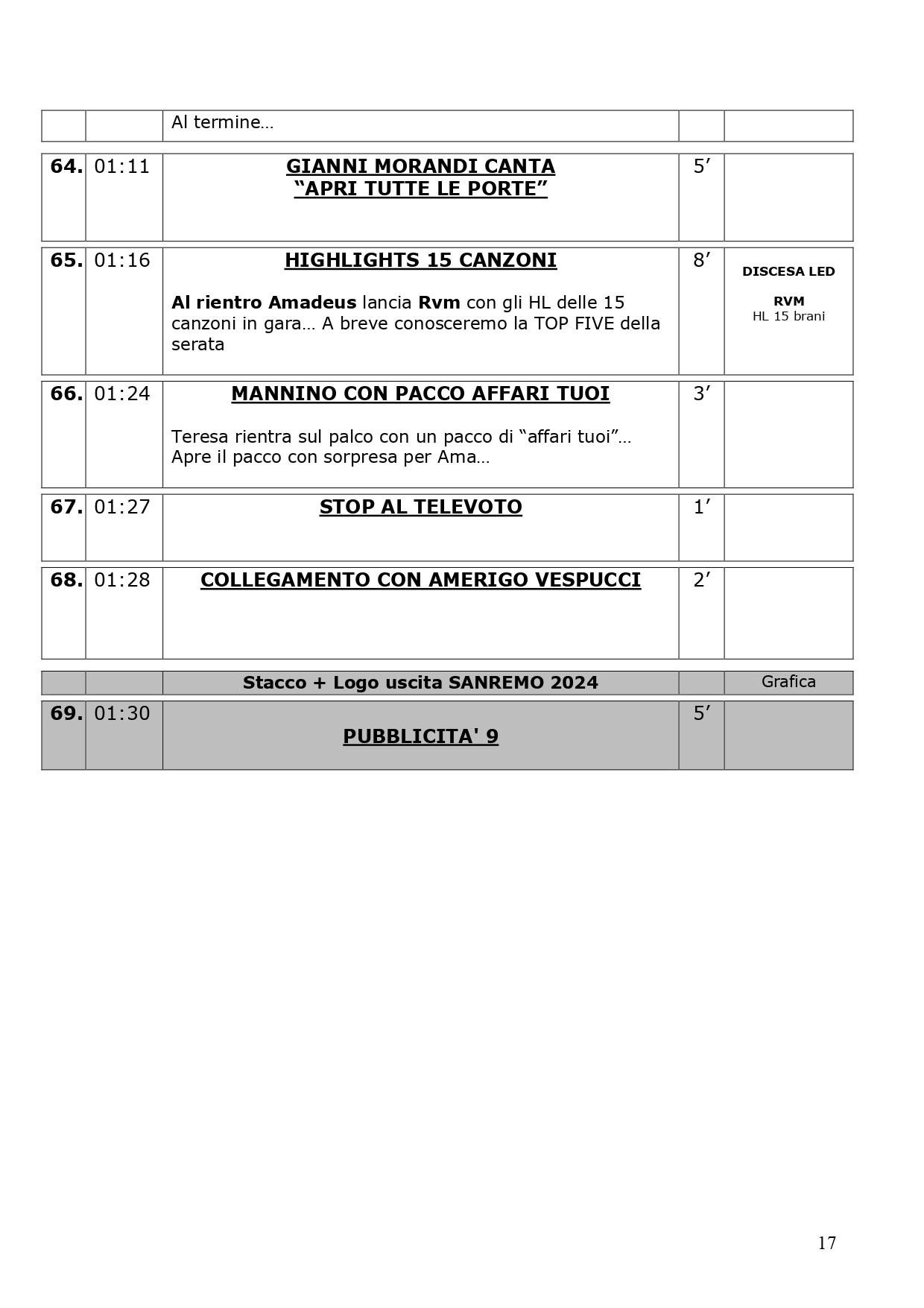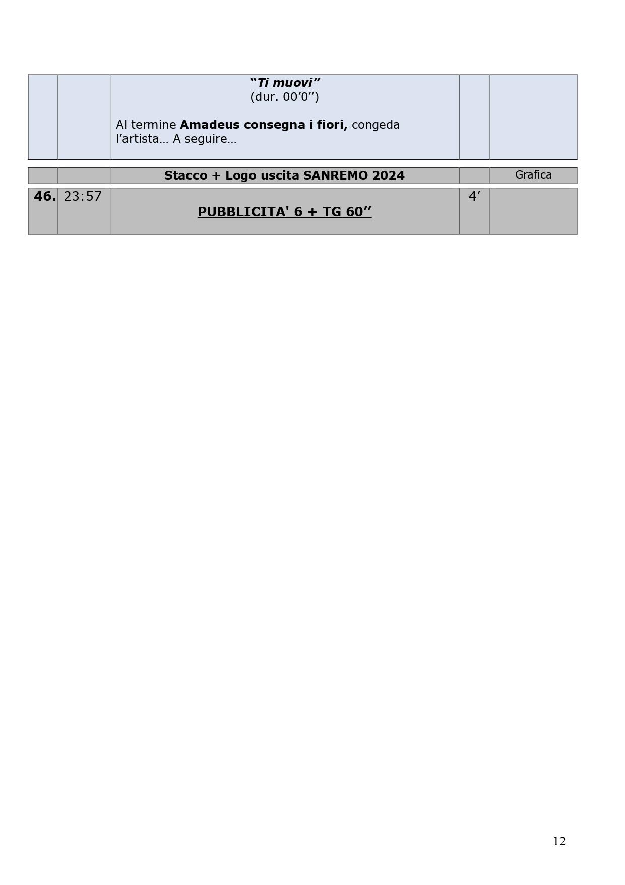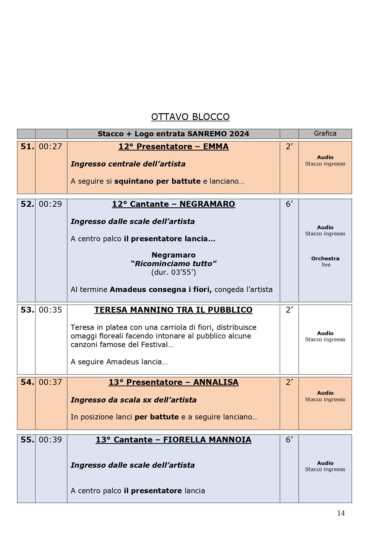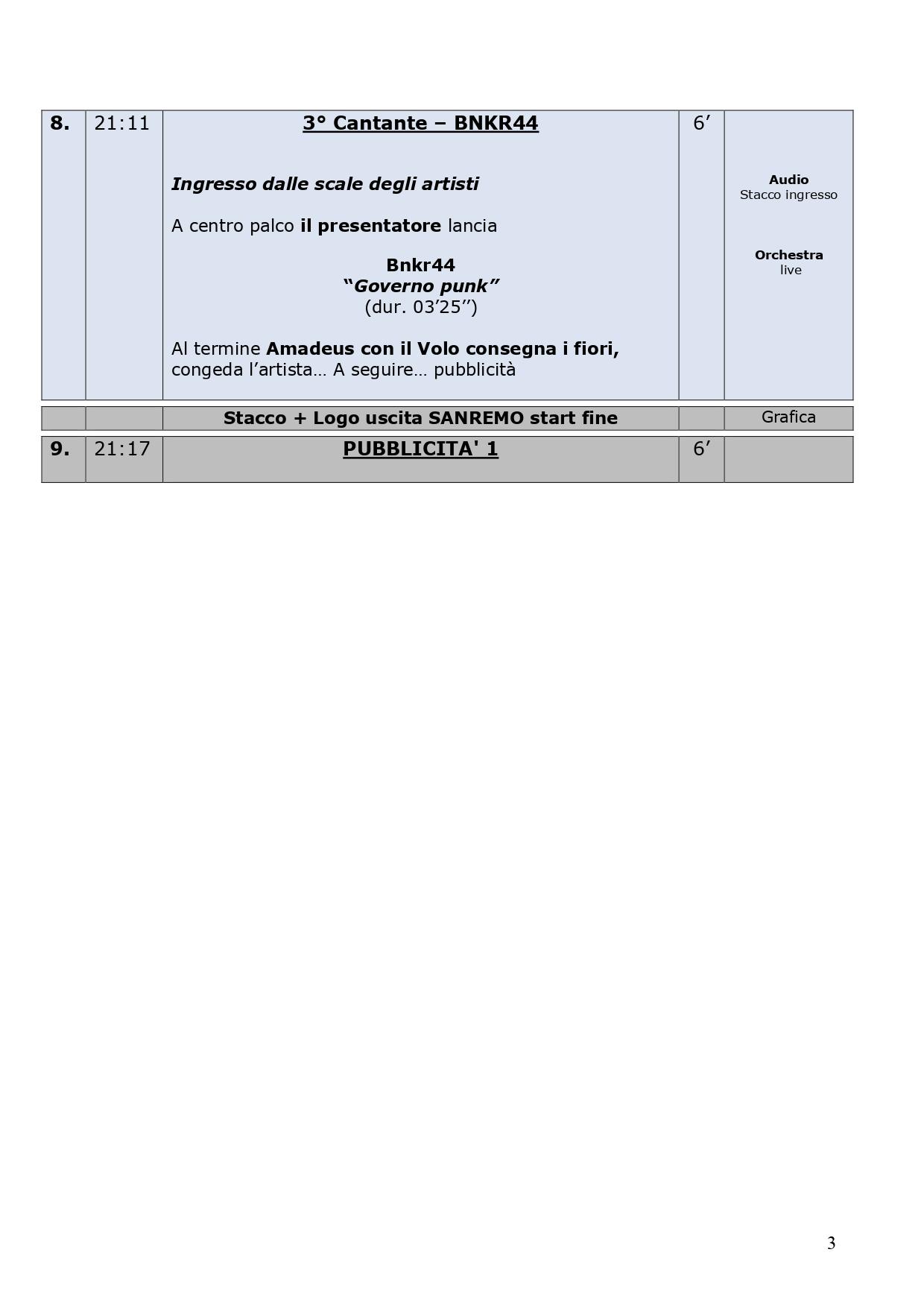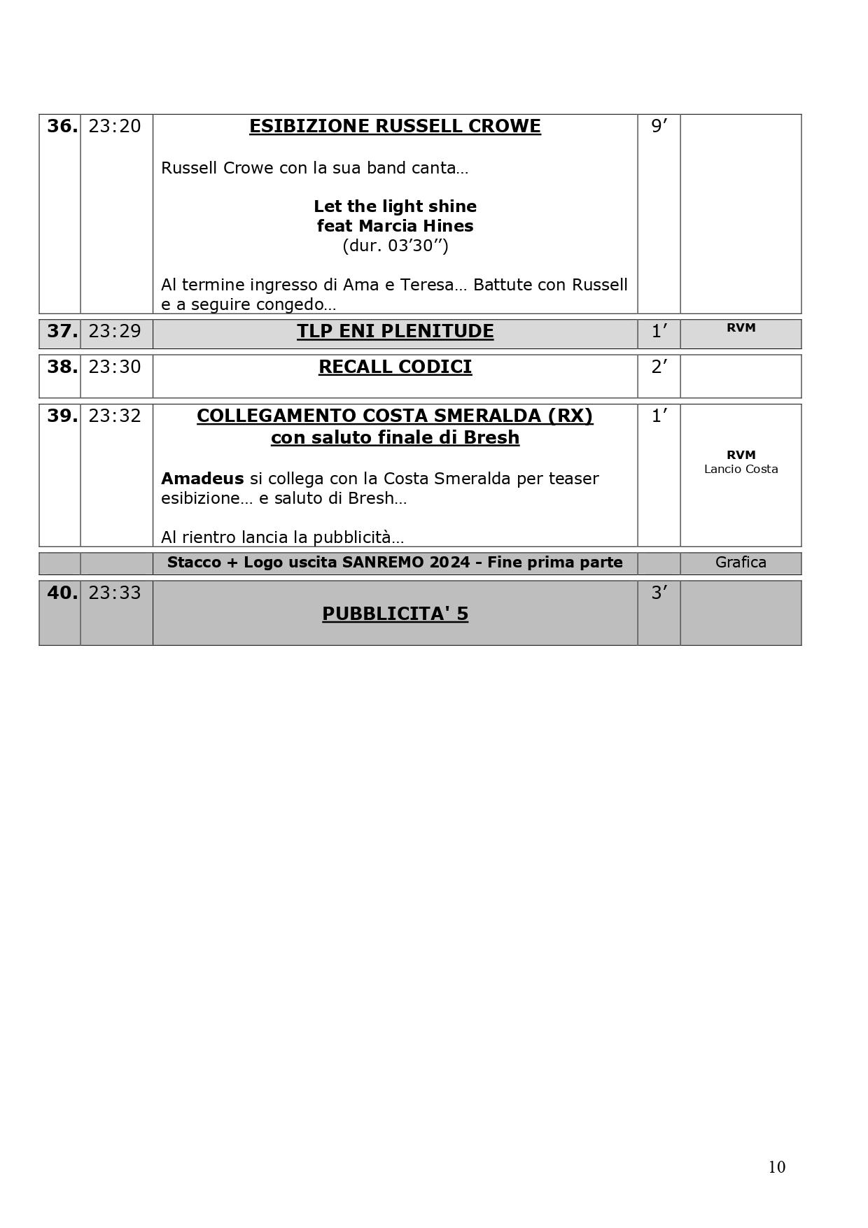 La scaletta completa della terza serata di Sanremo 2024: ecco le anticipazioni, gli orari dei 15 cantanti e degli ospiti e lo svolgimento passo dopo passo di giovedì 8 febbraio. Entra ormai nel vivo la kermesse canora trasmessa da Rai Uno e nella terza serata canteranno gli ultimi 15 cantanti dei 30 complessivi. Anche stasera gli altri 15 artisti, quelli che hanno cantato ieri, presenteranno i loro colleghi con accoppiamenti decisi dal sorteggio. In più, nei pdf diffusi dalla tv di Stato che vi mostriamo di seguito, ecco gli orari esatti di ogni esibizione, le anticipazioni sulle gag di Amadeus e sui momenti dedicati agli ospiti, che saranno, tra gli altri, Russell Crowe, Eros Ramazzotti e Gianni Morandi. La serata si chiuderà alle ore 01.45 circa. Ecco di seguito tutte le informazioni.