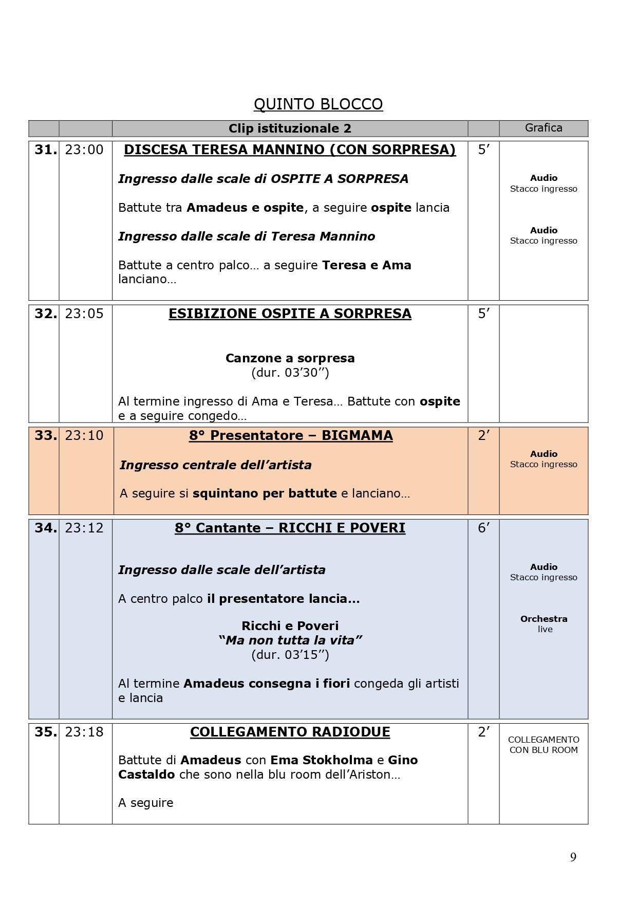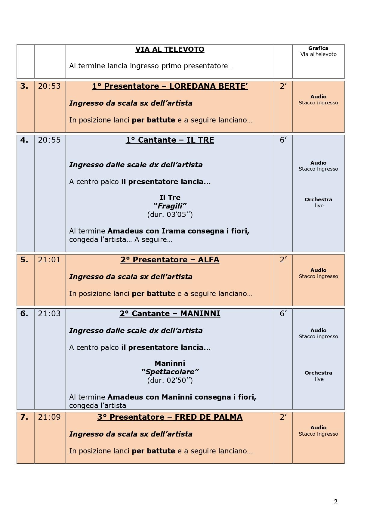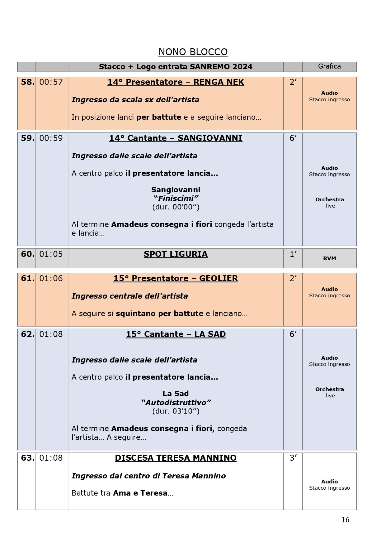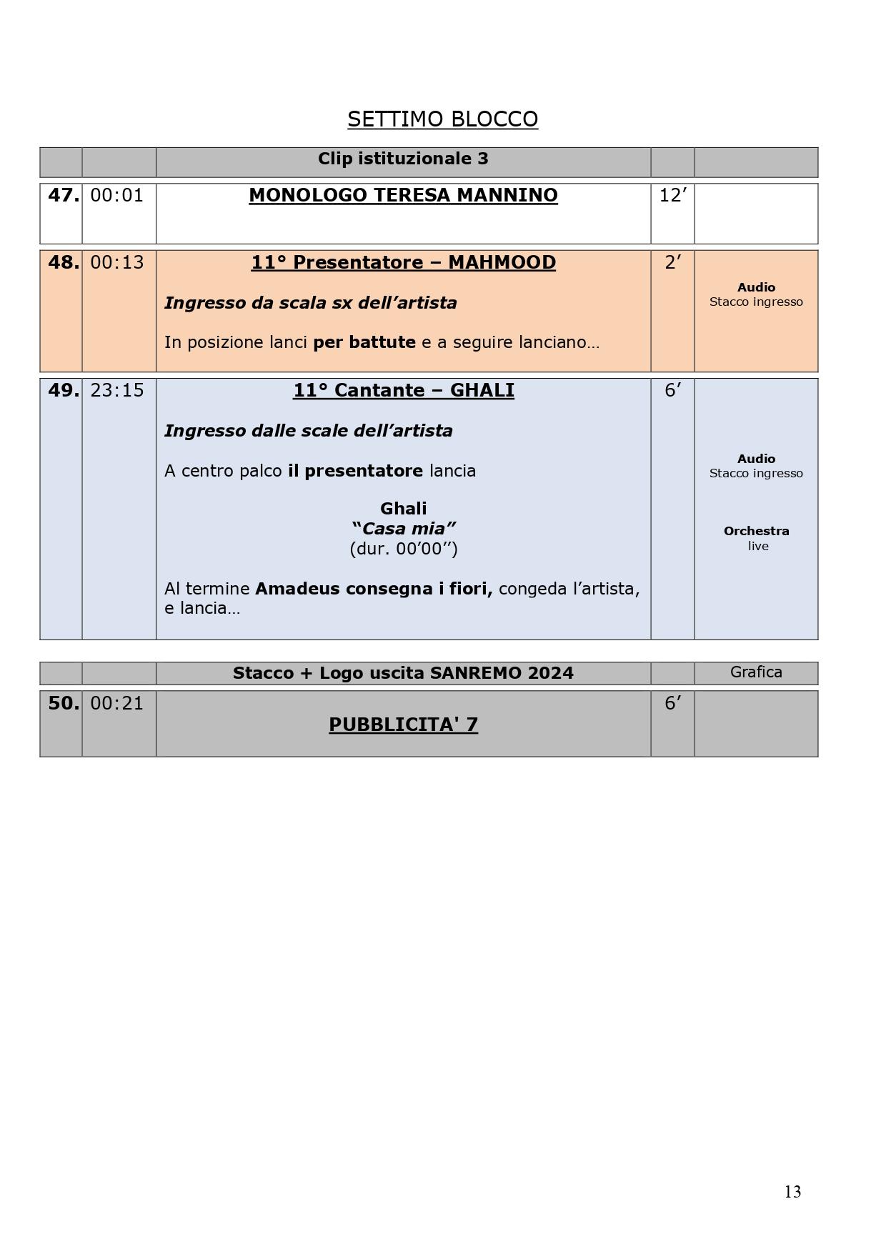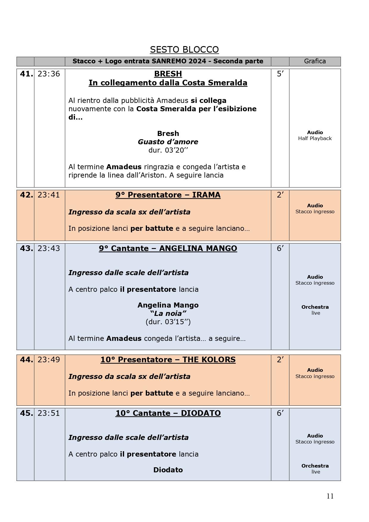 La scaletta completa della terza serata di Sanremo 2024: ecco le anticipazioni, gli orari dei 15 cantanti e degli ospiti e lo svolgimento passo dopo passo di giovedì 8 febbraio. Entra ormai nel vivo la kermesse canora trasmessa da Rai Uno e nella terza serata canteranno gli ultimi 15 cantanti dei 30 complessivi. Anche stasera gli altri 15 artisti, quelli che hanno cantato ieri, presenteranno i loro colleghi con accoppiamenti decisi dal sorteggio. In più, nei pdf diffusi dalla tv di Stato che vi mostriamo di seguito, ecco gli orari esatti di ogni esibizione, le anticipazioni sulle gag di Amadeus e sui momenti dedicati agli ospiti, che saranno, tra gli altri, Russell Crowe, Eros Ramazzotti e Gianni Morandi. La serata si chiuderà alle ore 01.45 circa. Ecco di seguito tutte le informazioni.